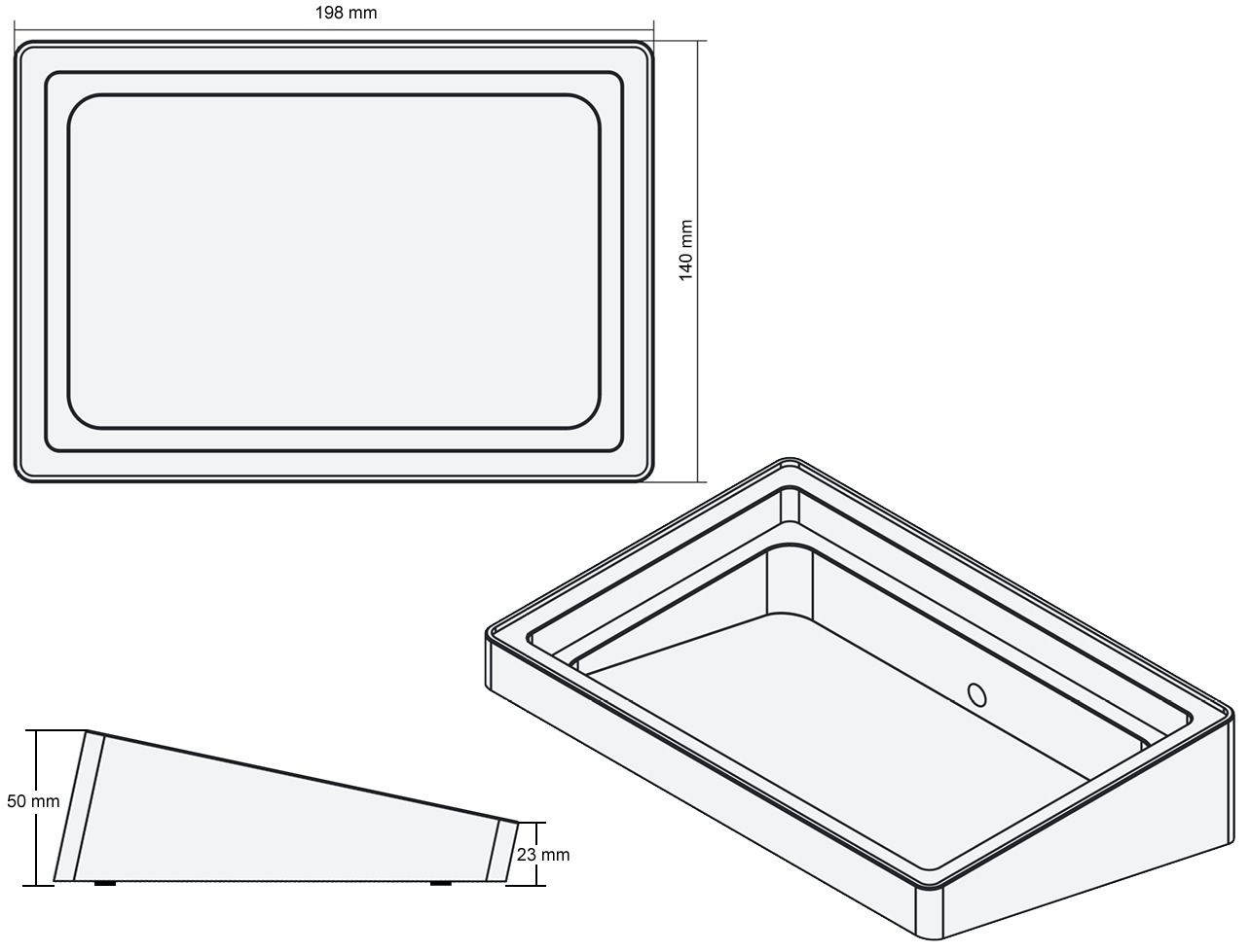 Dimensions desk housing | WxDxHfront/back 198mm x 140mm x 23/50mm |