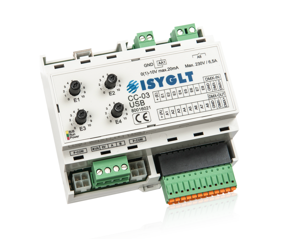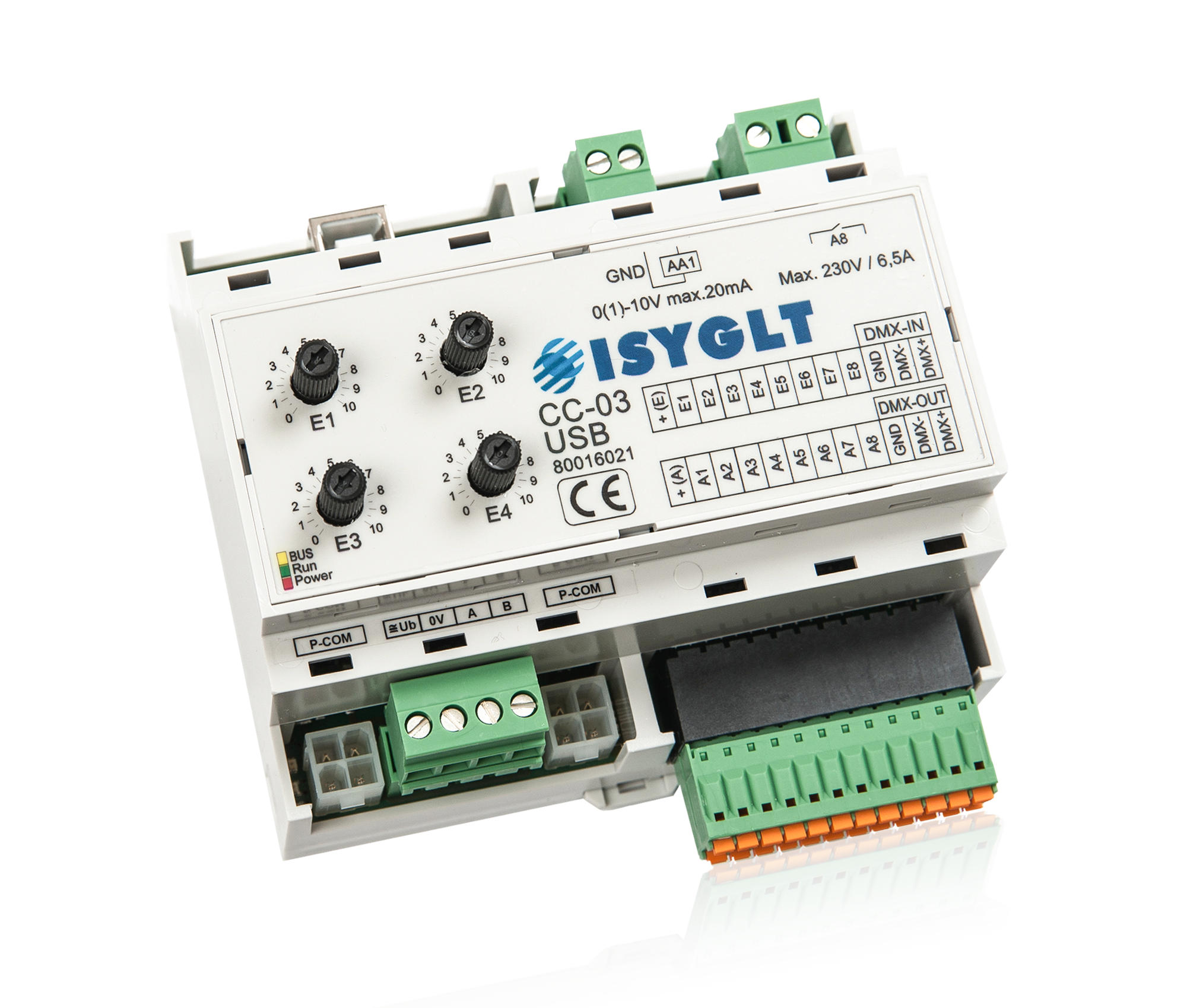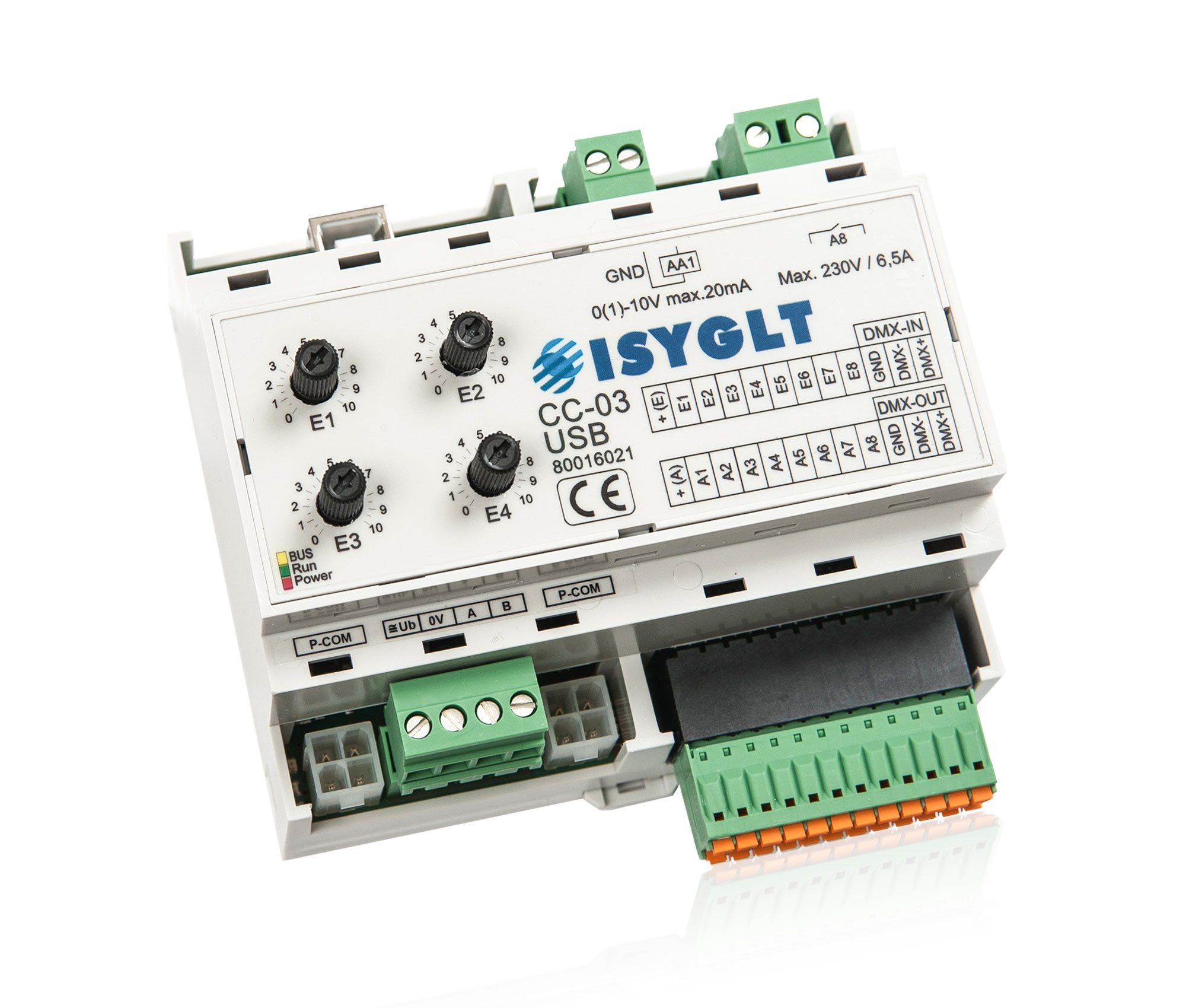 The CC-03-USB has been developed for the realisation of small control tasks. The hardware includes a 0(1)-10V interface, a relay output in hybrid technology, 4 potentiometers, 8 low voltage button connections and 8 low voltage feedback signals, as well as 16 channels DMX-IN and 16 channels DMX-OUT. With these requirements a multitude of small controls can be realised. The ISYGLT Controller is freely programmable and can be extended with the available ISYGLT BUS components.